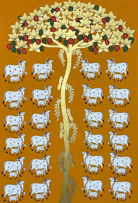 kamdhenu sacred cow life tree - Handmade Pichwai Painting- 3x3 Feet