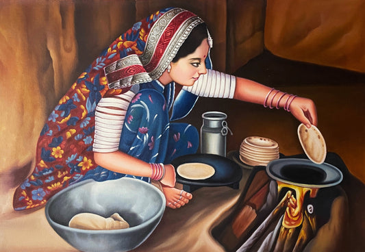 Indian Traditional Painting, Lady Busy in making Chapaatee on Fire Place, home decor, wall art on canvas, painting, wall Painting