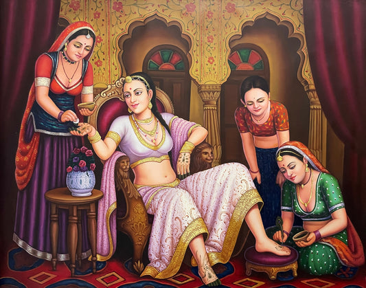 Girls Applying Mehndi on Brides' Hand, Oil painting on canvas