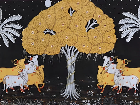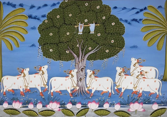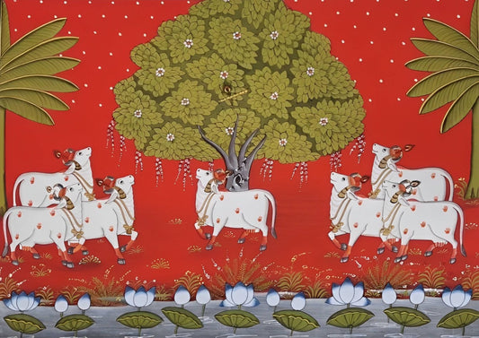 Set of 3 Shrinathji Pichwai and Cow Pichwai Painting Art Handmade Design Natural Stone color on cloth Indian Decor Paintings, Wall art
