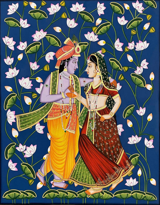 Radha Krishna Golden Detailed Pichwai Handmade Painting On Fabric with Lotus Background, Home Decor, Wall Decor